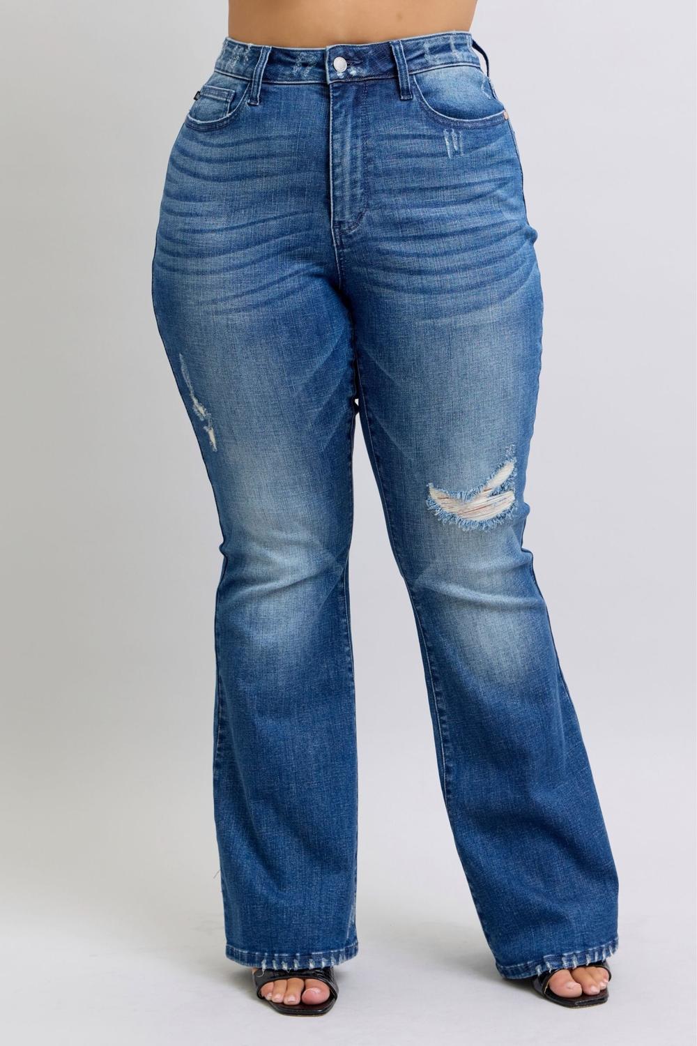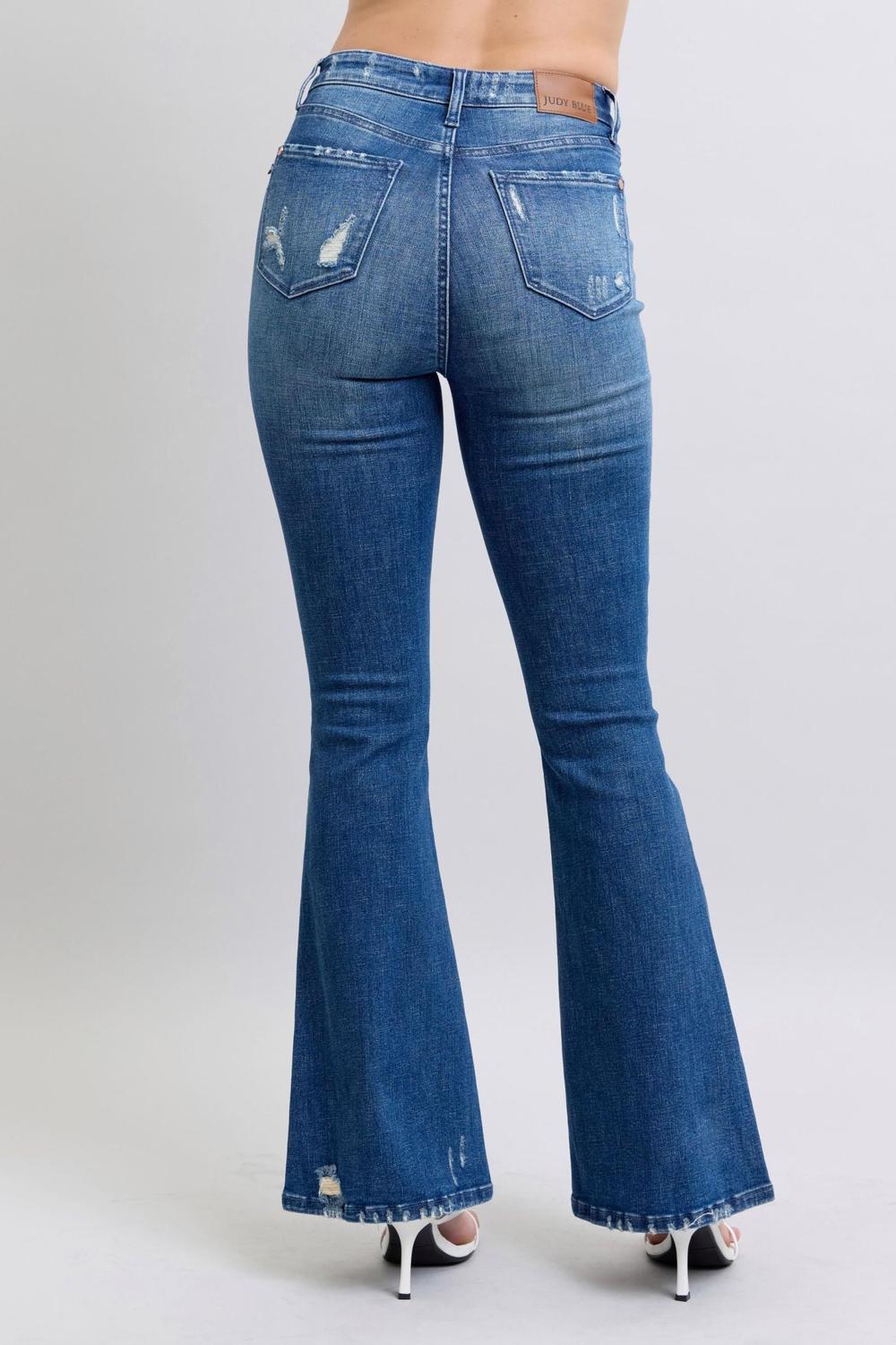 Turn heads with a true throwback look — the Judy Blue High Waist Contrast Wash Destroy Flare Jeans deliver all the vintage-inspired charm you love with Judy Blue’s signature stretch and comfort. Featuring a flattering high-rise waist, dramatic flare leg, and contrast wash panels that accentuate your curves, this pair blends retro energy with modern flair. Light distressing adds that effortlessly lived-in touch for the perfect balance of polish and edge.