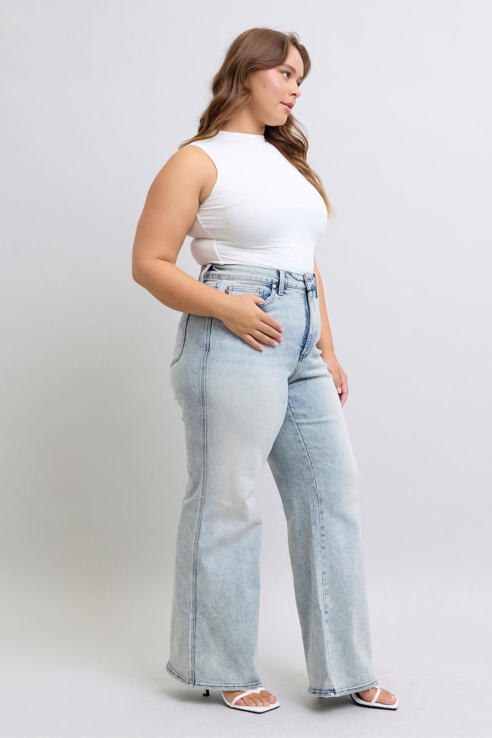 Step into retro-inspired style with these high waist wide leg jeans from Judy Blue. Featuring tummy control technology for a smoothing fit, these jeans combine comfort and structure with a classic vintage silhouette. The wide leg cut flares out from the mid-thigh, giving you a versatile look that’s perfect for dressing up or keeping casual.