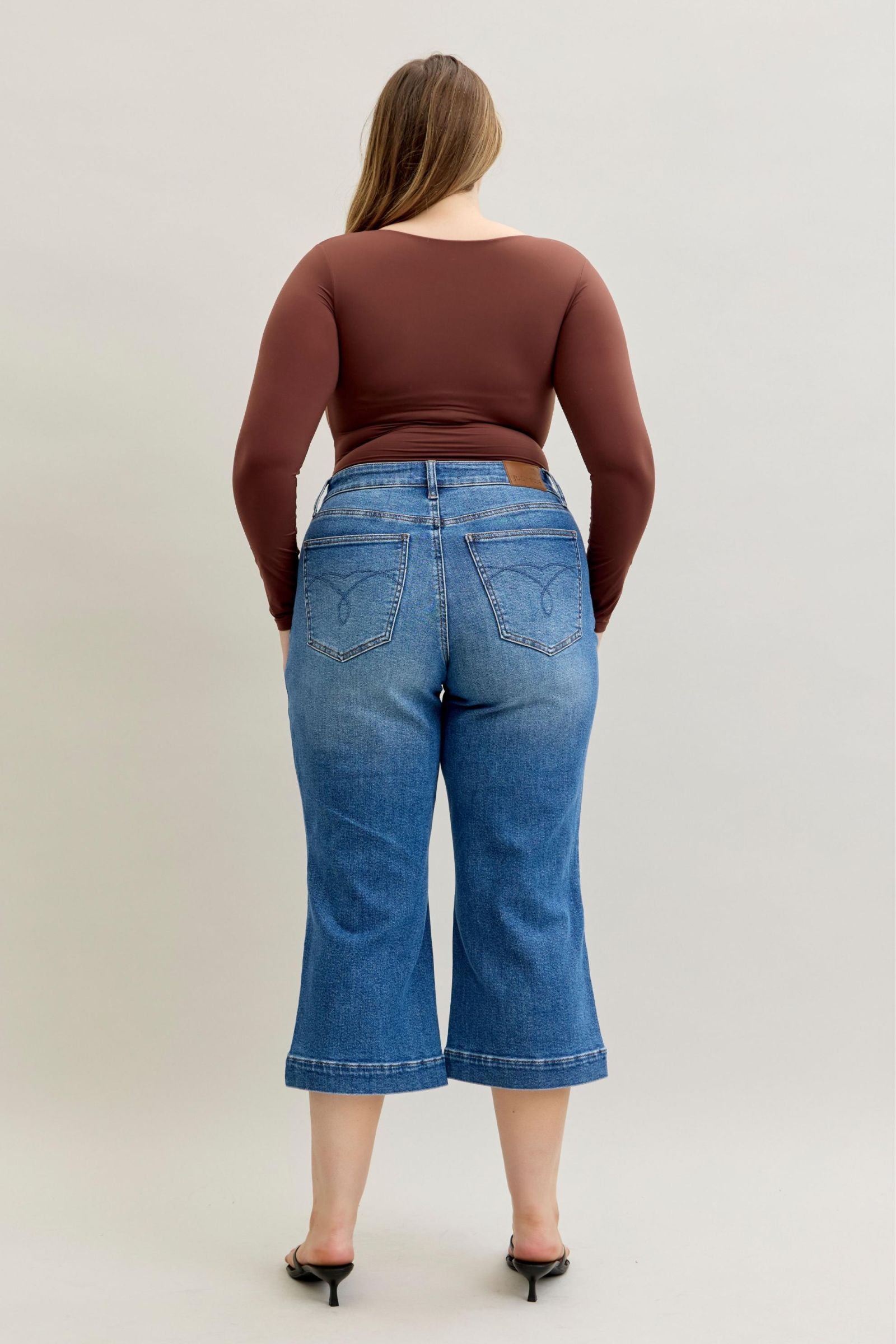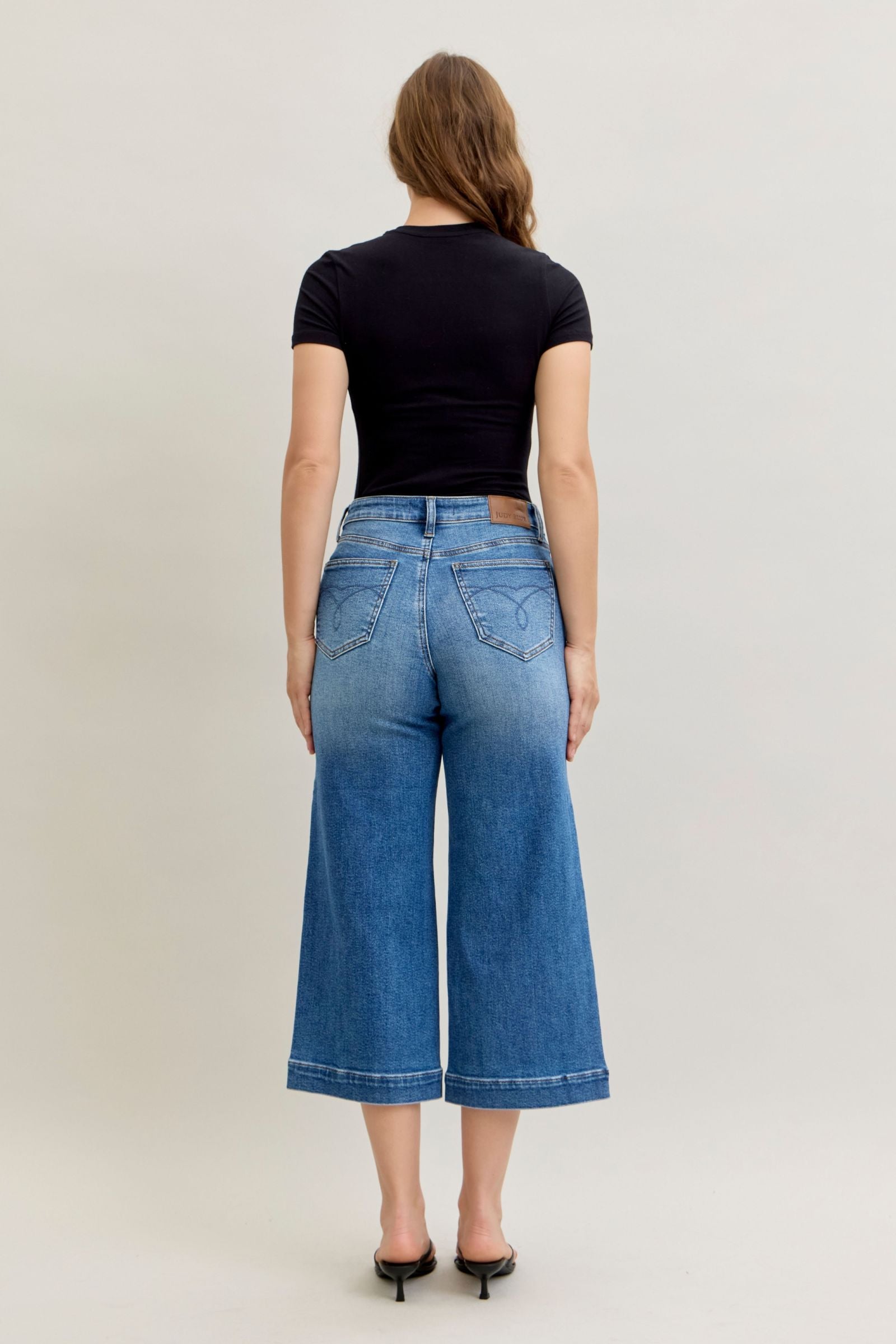 With their cropped wide leg cut, vintage pocket detailing, and wide hem finish, these Judy Blue jeans are the perfect pair to dress up or down for any season.