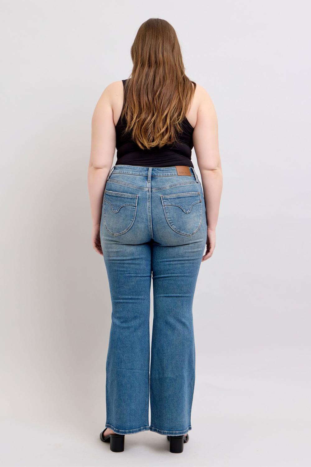 Judy Blue Mid Rise Tummy Control Vintage Wash & Back Shield Pockets Flare Denim Jeans