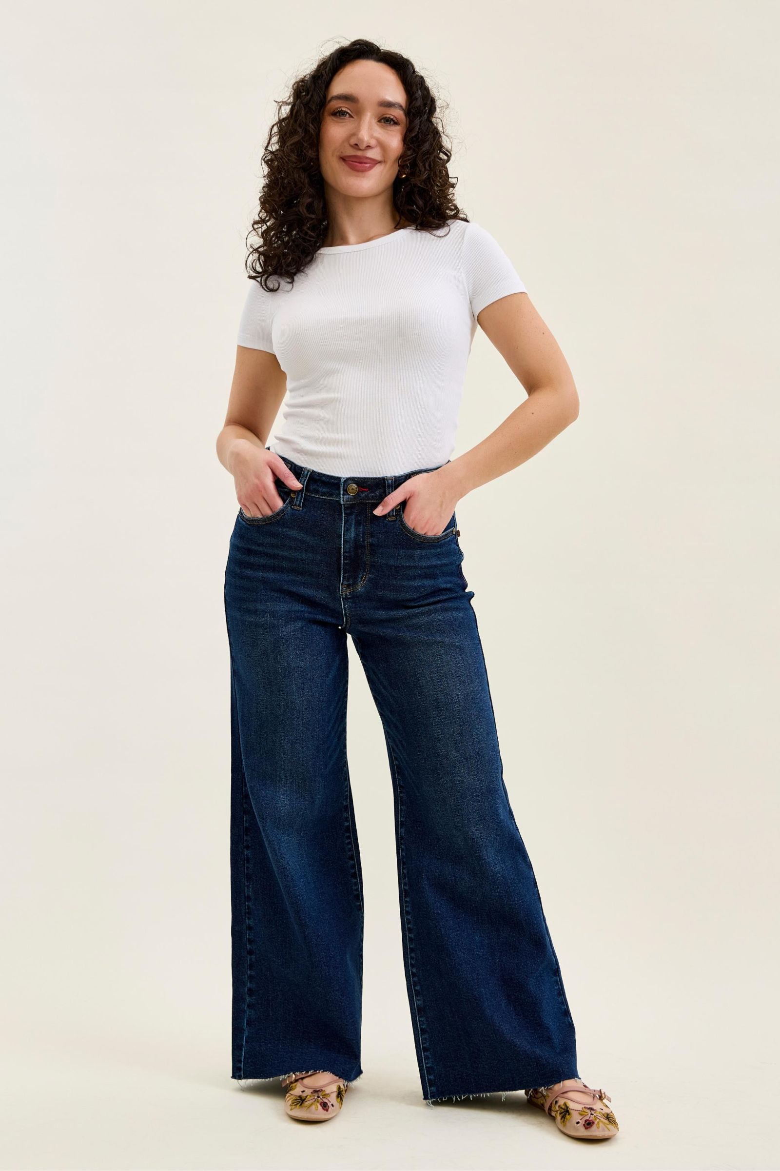 The high waist creates a flattering silhouette, and the wide leg fit brings that effortless, on-trend look. Finished with a raw hem for a touch of edge, these jeans are perfect for dressing up with a heel or keeping it casual with sneakers.