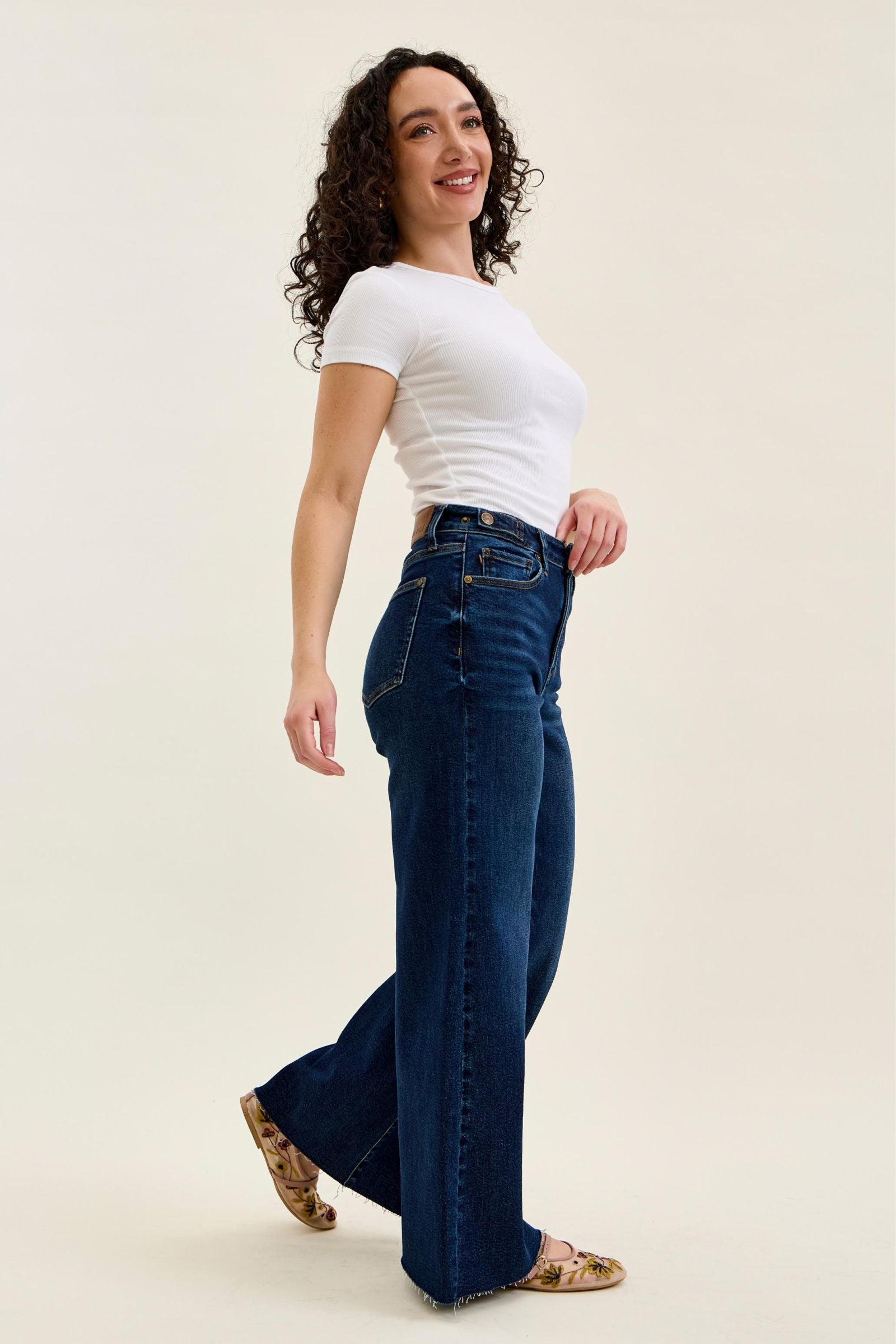 A throwback vibe with a modern twist—these retro wide leg jeans are a statement piece you’ll keep reaching for. The dark wash keeps them classic, while the adjustable waistband tabs give you a customizable fit that hugs just right without sacrificing comfort.