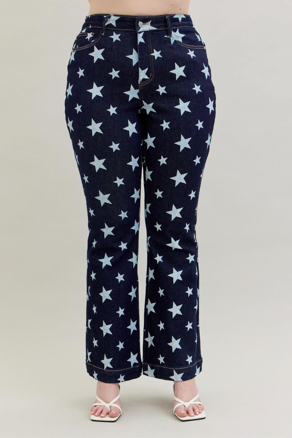 Make a statement with every step — the Judy Blue High Waist All Over Star Print Flare Jeans combine a bold, patriotic-inspired design with Judy Blue’s famously comfortable stretch. The star print is subtle yet eye-catching, while the flare silhouette creates a long, balanced, flattering shape. Finished in a rich rinse wash, these jeans are perfect for concerts, holidays, fairs, and standout everyday outfits.