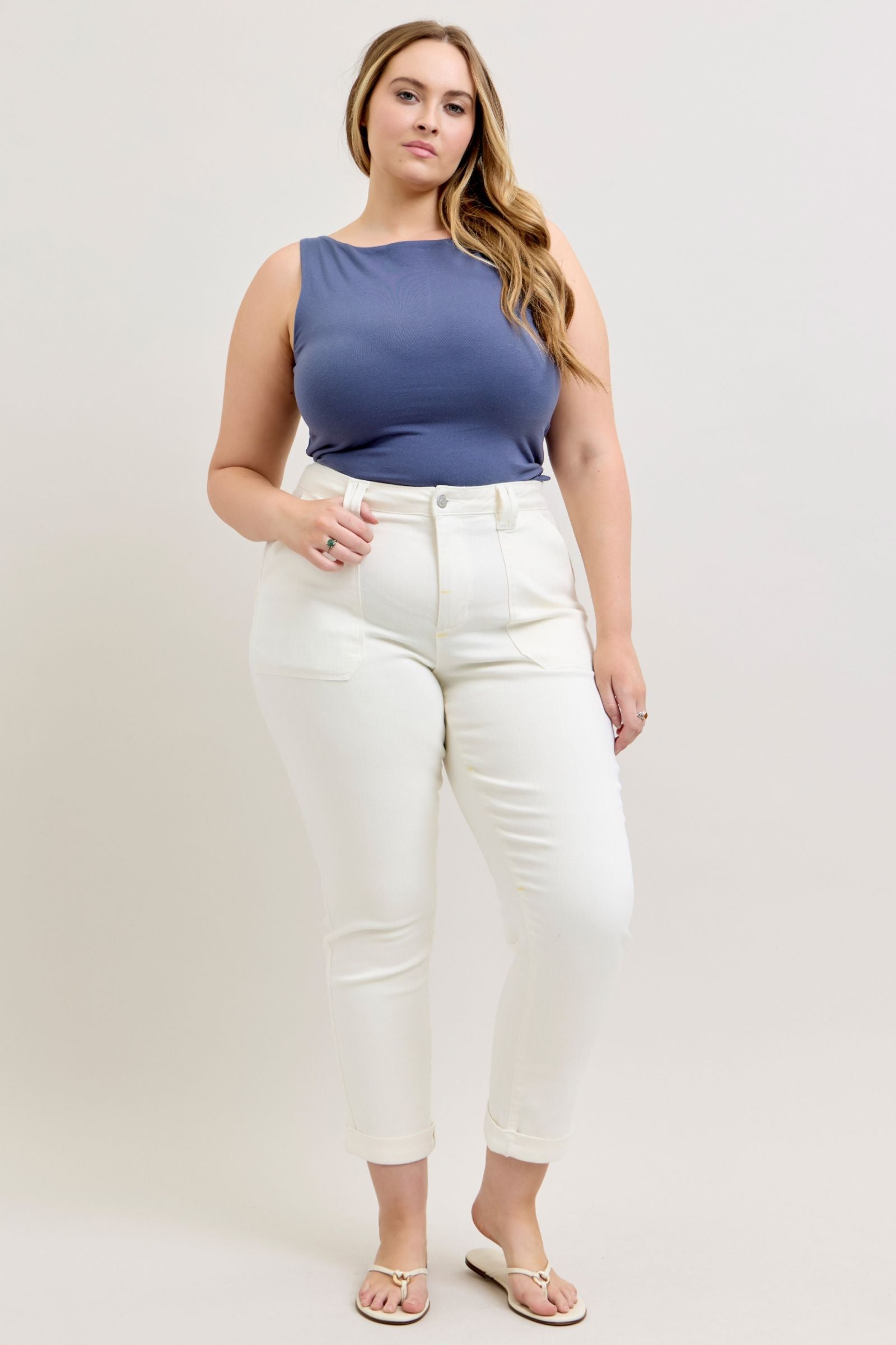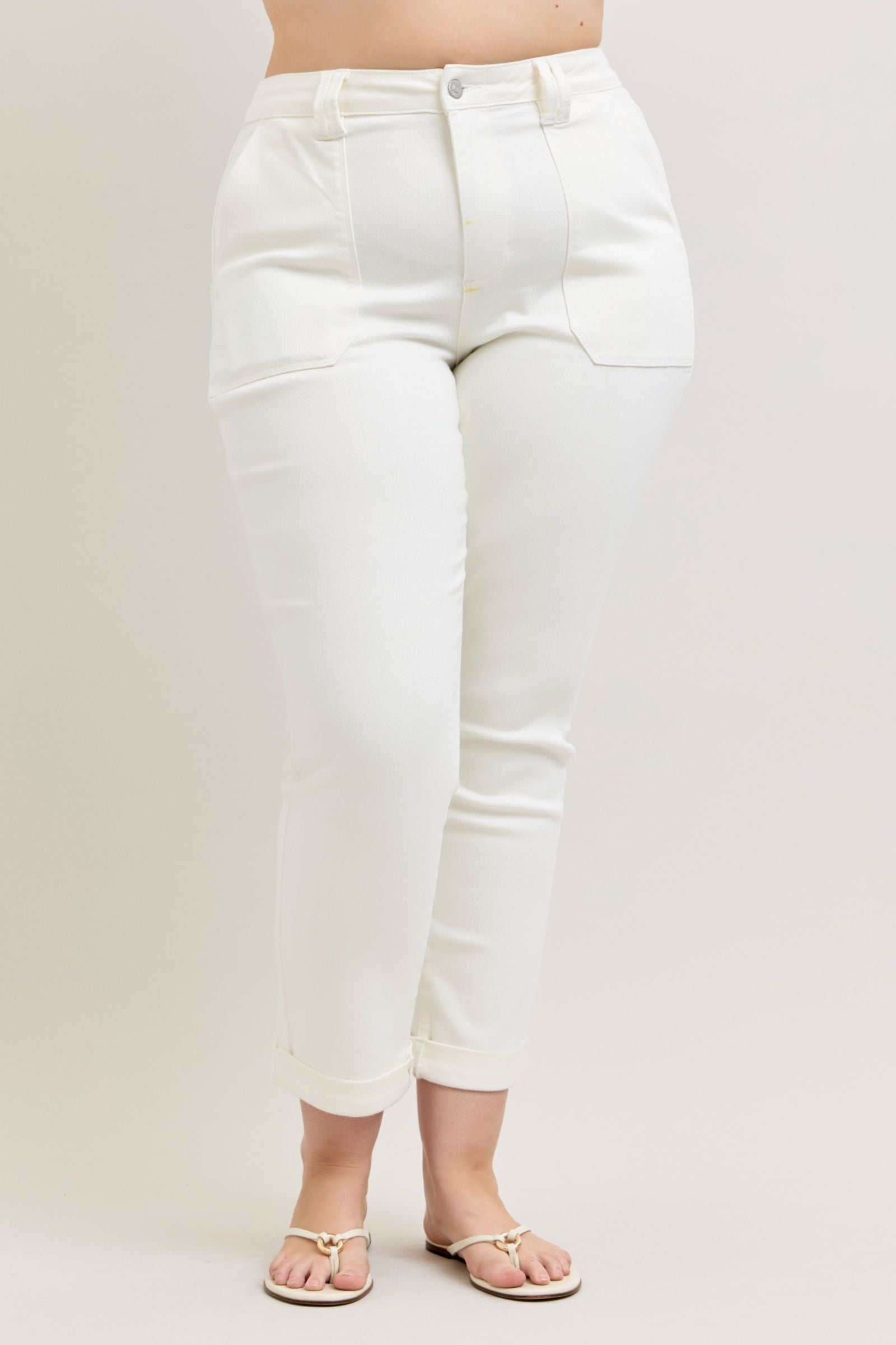 Plus Sizes 14W–24W: Front Rise 12” | Inseam 28” cuffed / 31” uncuffed