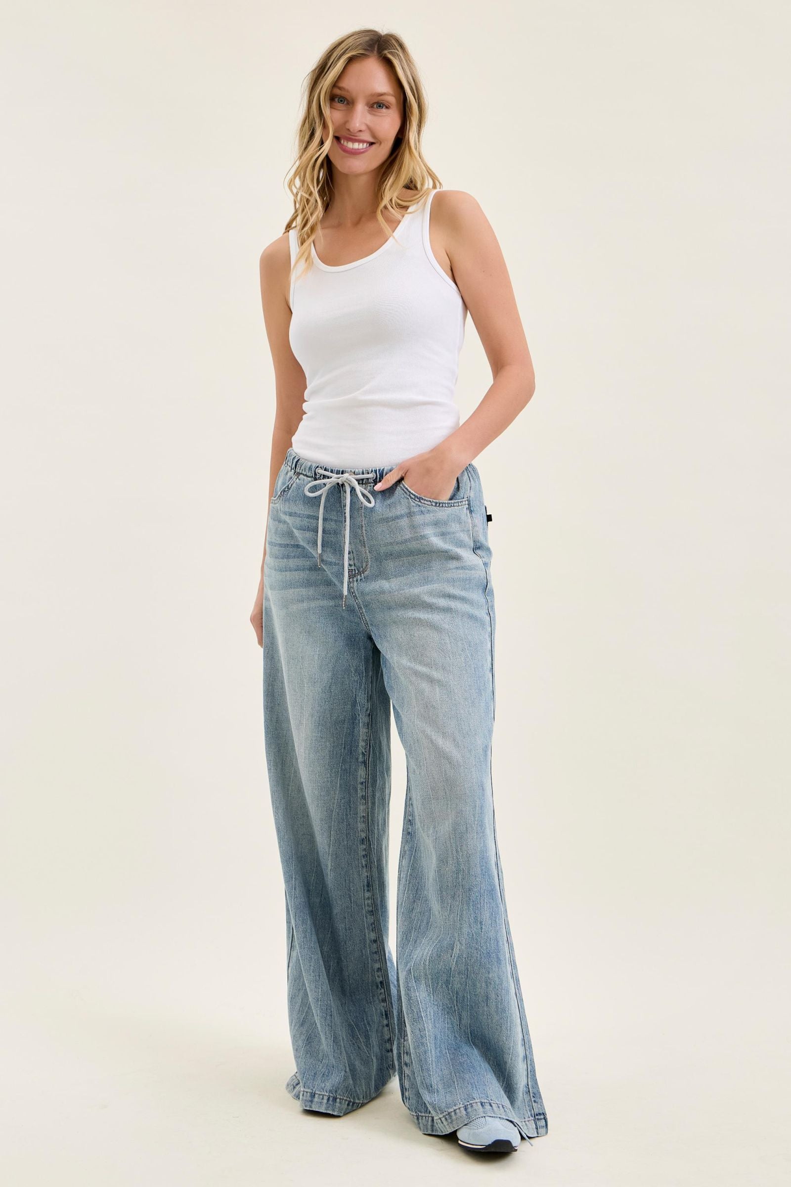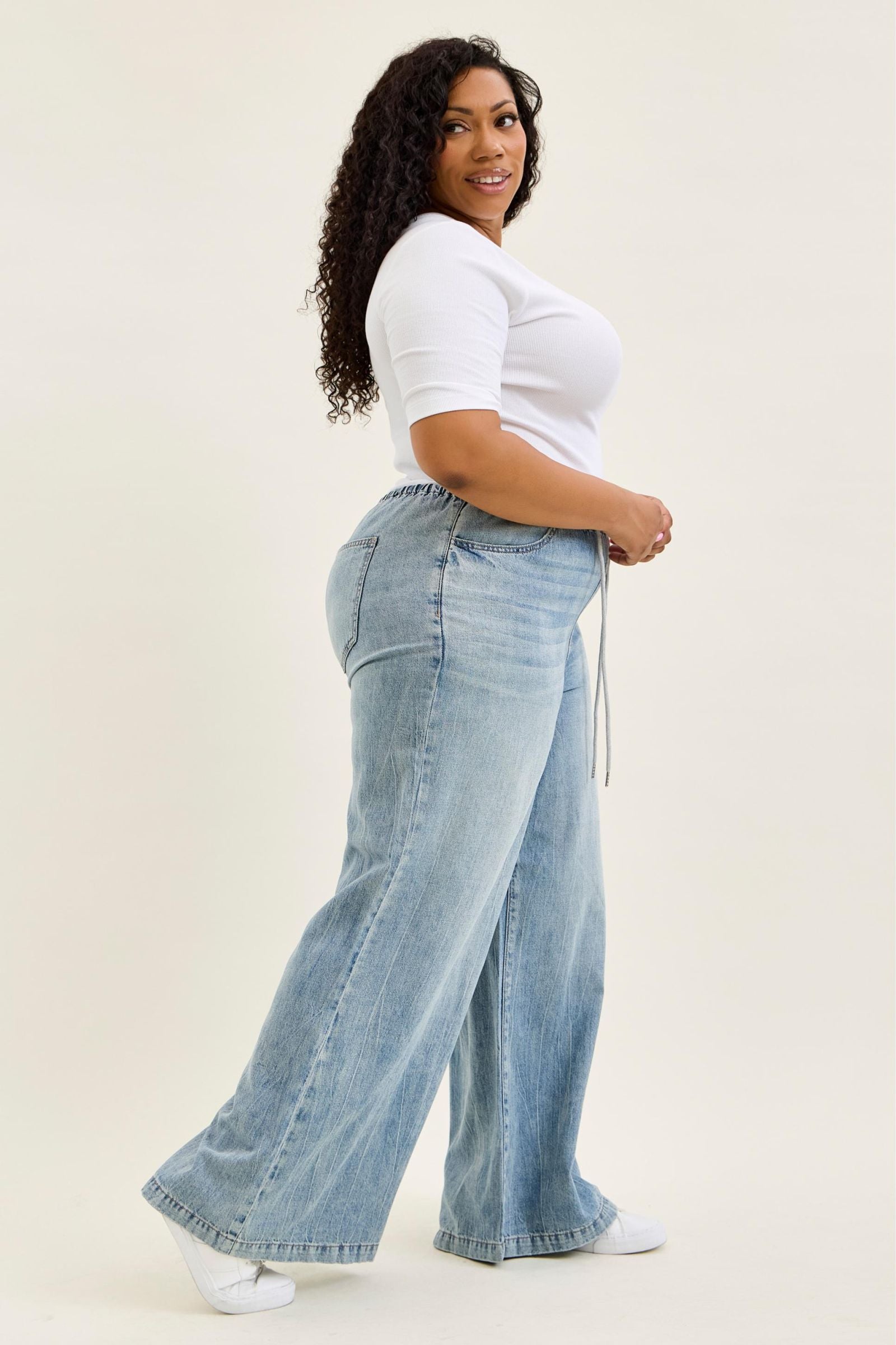 Bring timeless style and modern comfort together with these palazzo denim jeans from Judy Blue. Featuring a flattering high waist and wide palazzo leg, these jeans are finished with an elastic waistband. Crafted with Judy Blue’s signature stretch denim, they balance structure and softness for all-day wear.