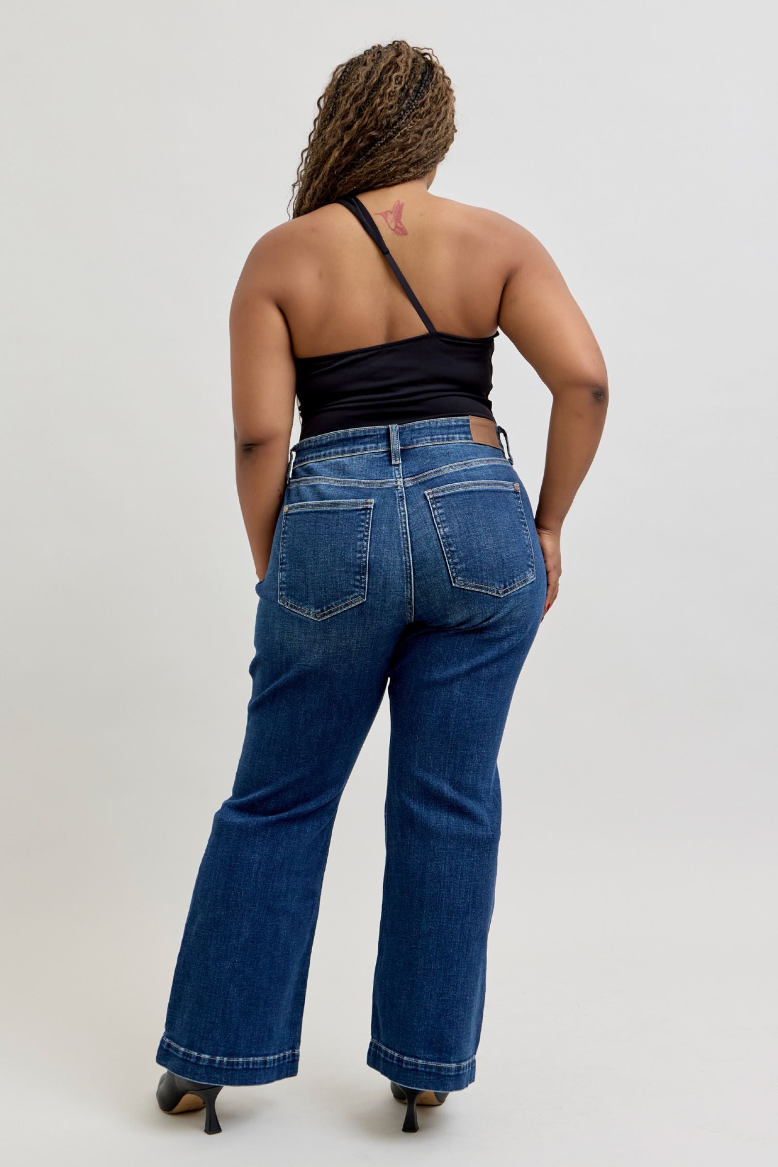 Step into timeless style with Judy Blue’s high waist trouser flare jeans. Designed for a sleek fit through the thigh that flares out beautifully from the knee, these jeans elongate your silhouette while giving you that perfect polished look.