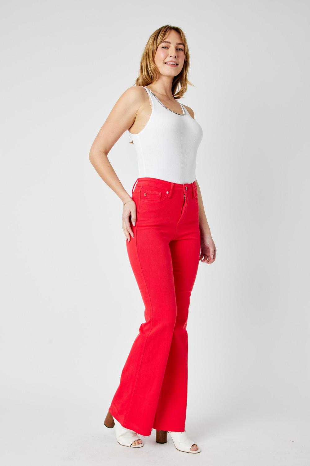 Stand out in bold color and flattering comfort with the Judy Blue High Waist Tummy Control Garment Dyed Red Flare Jeans. Designed with Judy Blue’s built-in tummy control panel, these jeans smooth and support your midsection while delivering incredible stretch and style. The vibrant red garment-dyed finish and leg-lengthening flare silhouette make them a statement piece that turns heads wherever you go.