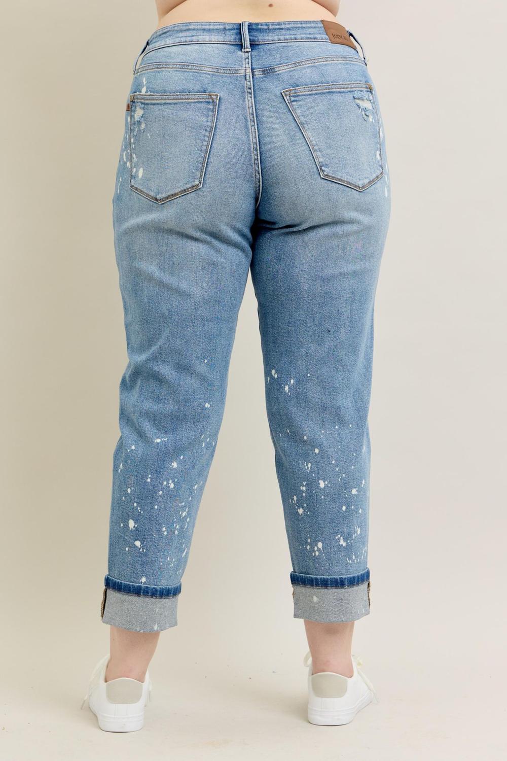 Judy Blue Mid Rise Bleach Splatter Single Cuff Boyfriend Denim Jeans