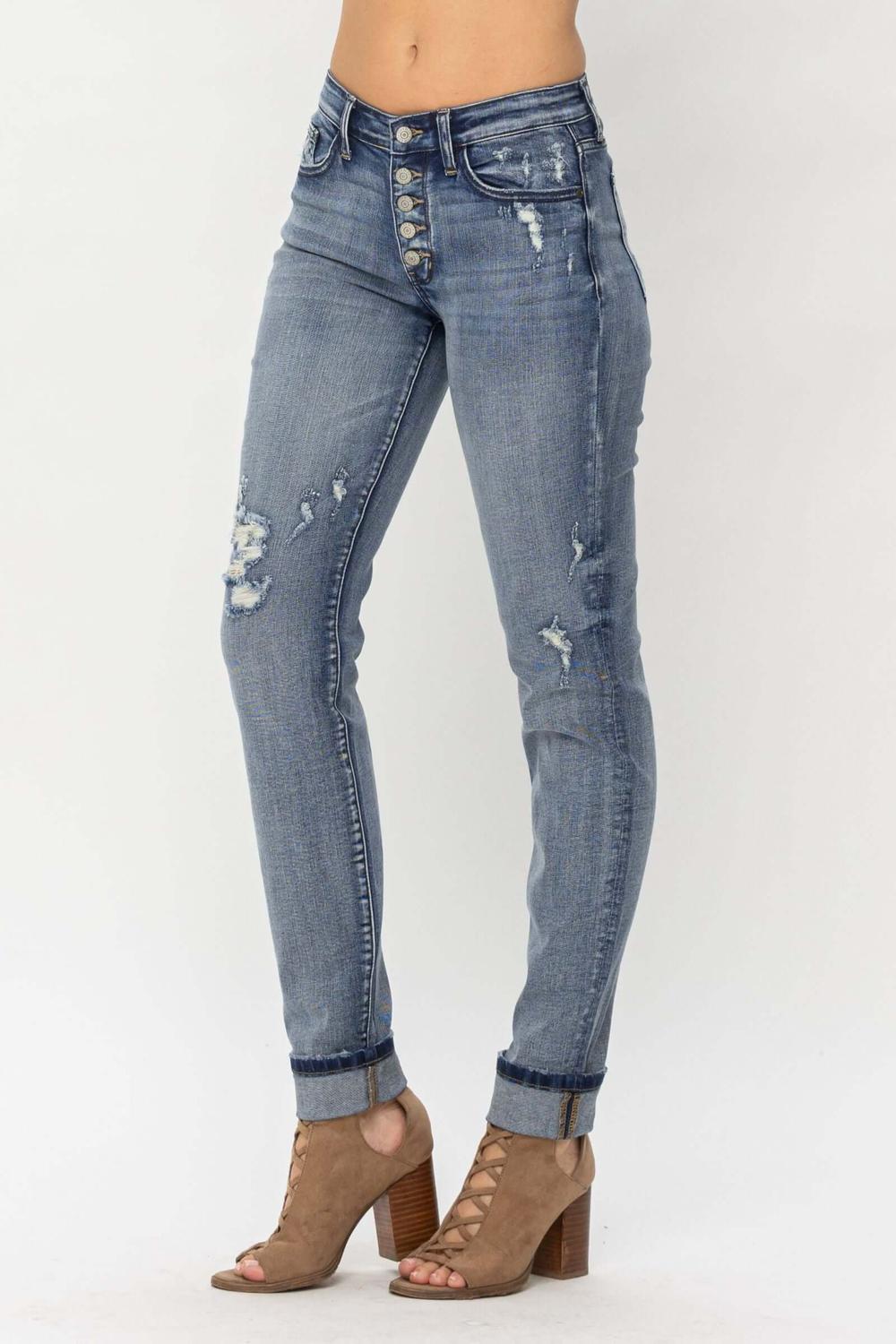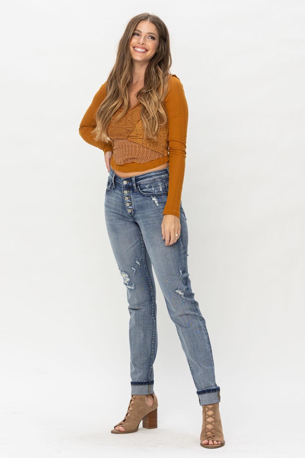 Judy Blue Mid Rise Button Fly Contrast Wash & Cuff Options Tall Boyfriend Denim