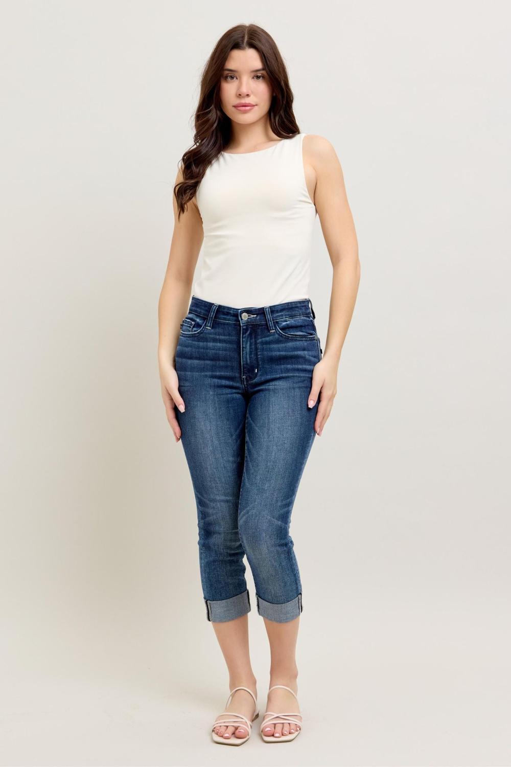 Judy Blue Mid Rise Dark Wash Cuffed Capri Denim Jeans