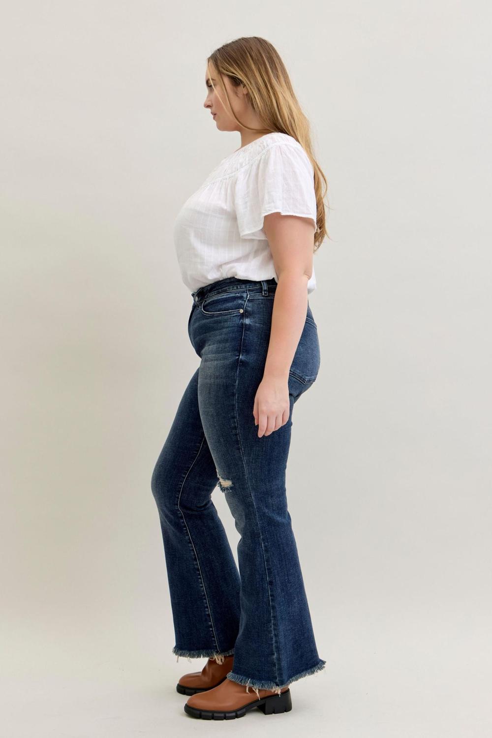 Perfect for taller women (or anyone wanting extra length), these Judy Blue destroyed fray hem flares are a flattering, statement-making denim you’ll want to wear again and again.