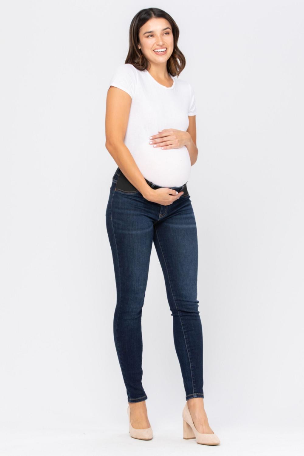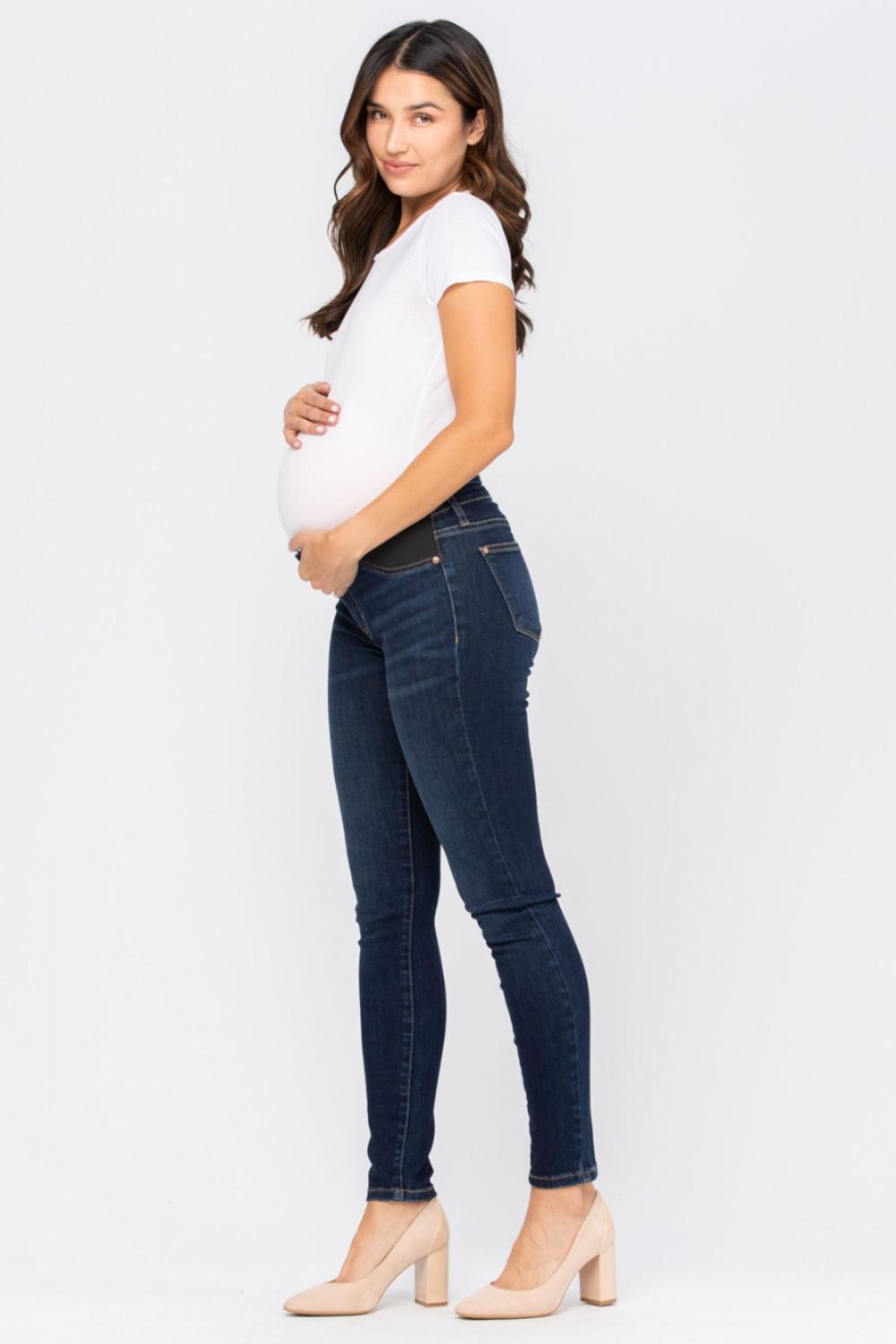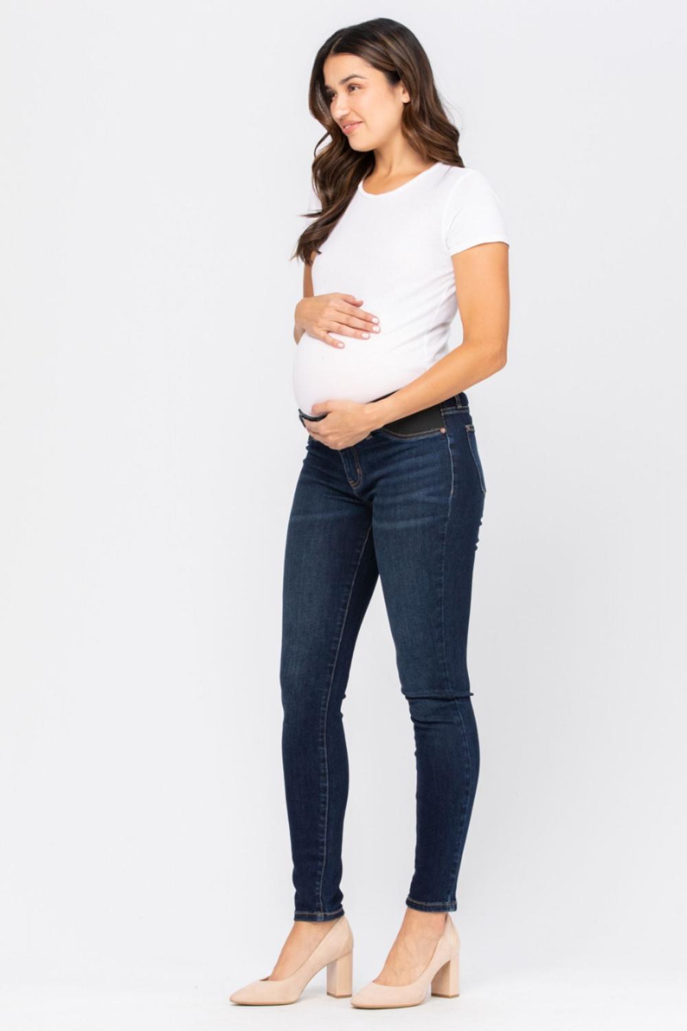Stay stylish and comfortable throughout your pregnancy with Judy Blue’s maternity destroyed skinny jeans. Designed with elastic side panels for stretch and support, these jeans adapt with you as your bump grows. The trendy destroyed details and dark wash keep your look modern and versatile—perfect for pairing with tees, sweaters, or maternity tops.