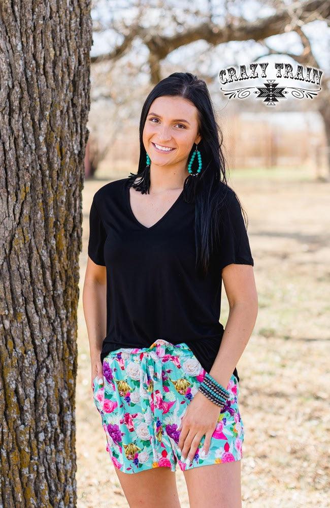 Bright, bold, and beautifully western—these Floral Frenzy Highlander Shorts from Crazy Train bring fun energy to any outfit! Featuring a vibrant turquoise floral print, these shorts are made with a soft, stretchy blend for maximum comfort and movement.