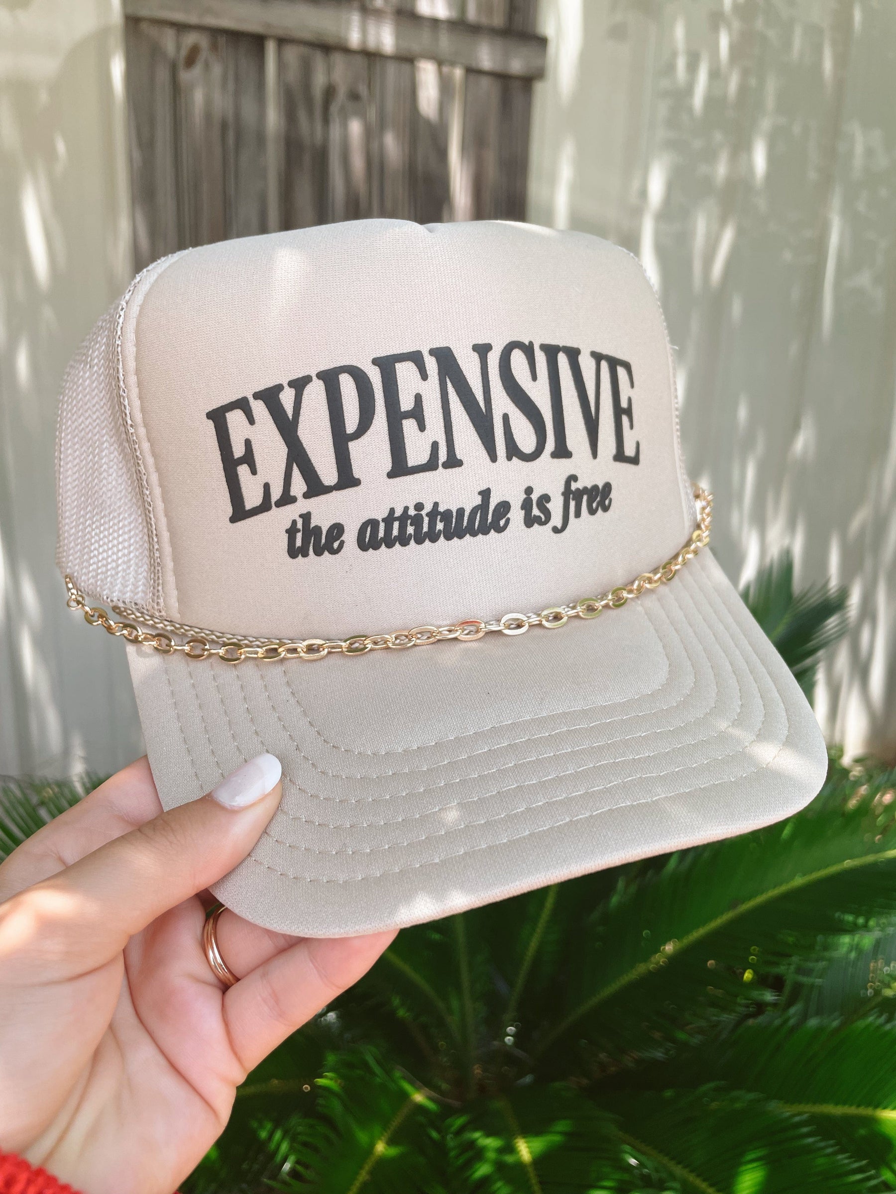 High-end energy, effortless delivery. This tan foam trucker hat features a bold brown puff ink graphic that reads "Expensive – The Attitude Is Free,"serving looks with a side of sass. With its structured front, breathable mesh back, and adjustable snap closure, it's made for comfort with an edge. Whether you're dressing it up or keeping it casual, this hat speaks volumes—so you don’t have to.