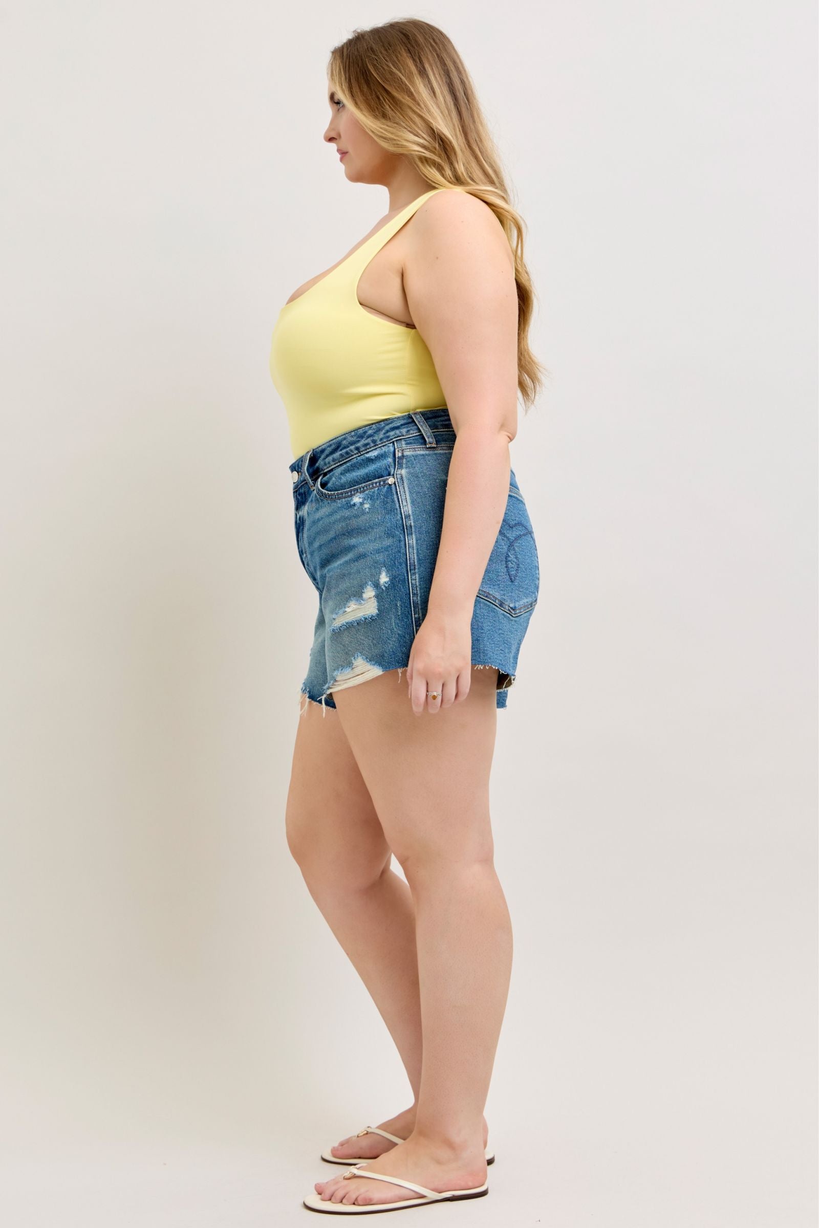 Get the best of both worlds with the Judy Blue High Waist Rigid Magic Cut Off Shorts—structured where you want it and stretchy where you need it. Designed in a fresh medium wash, these shorts feature a flattering high-rise fit, trendy distressed details, and a cut-off distressed hem for that perfectly lived-in look.