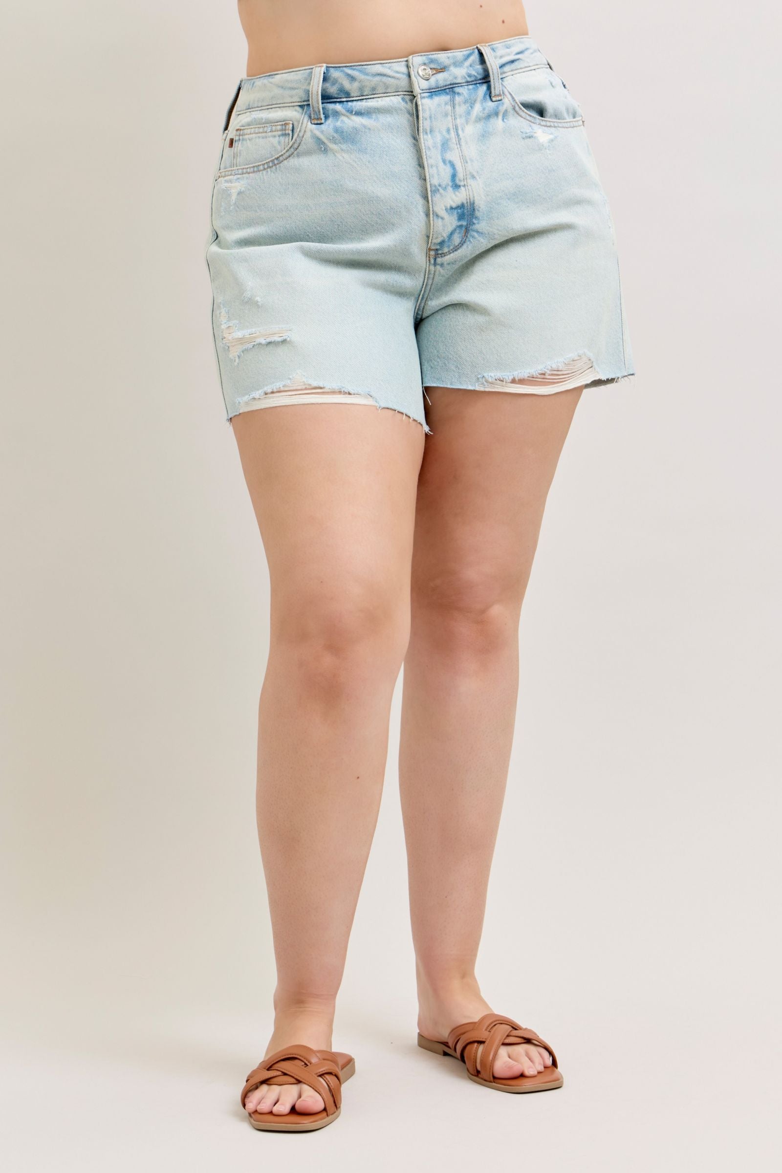 Get the best of both worlds with the Judy Blue High Waist Rigid Magic Cut Off Shorts—structured where you want it and stretchy where you need it. Designed in a fresh light wash, these shorts feature a flattering high-rise fit with button fly, trendy distressed details, and a cut-off distressed hem for that perfectly lived-in look.