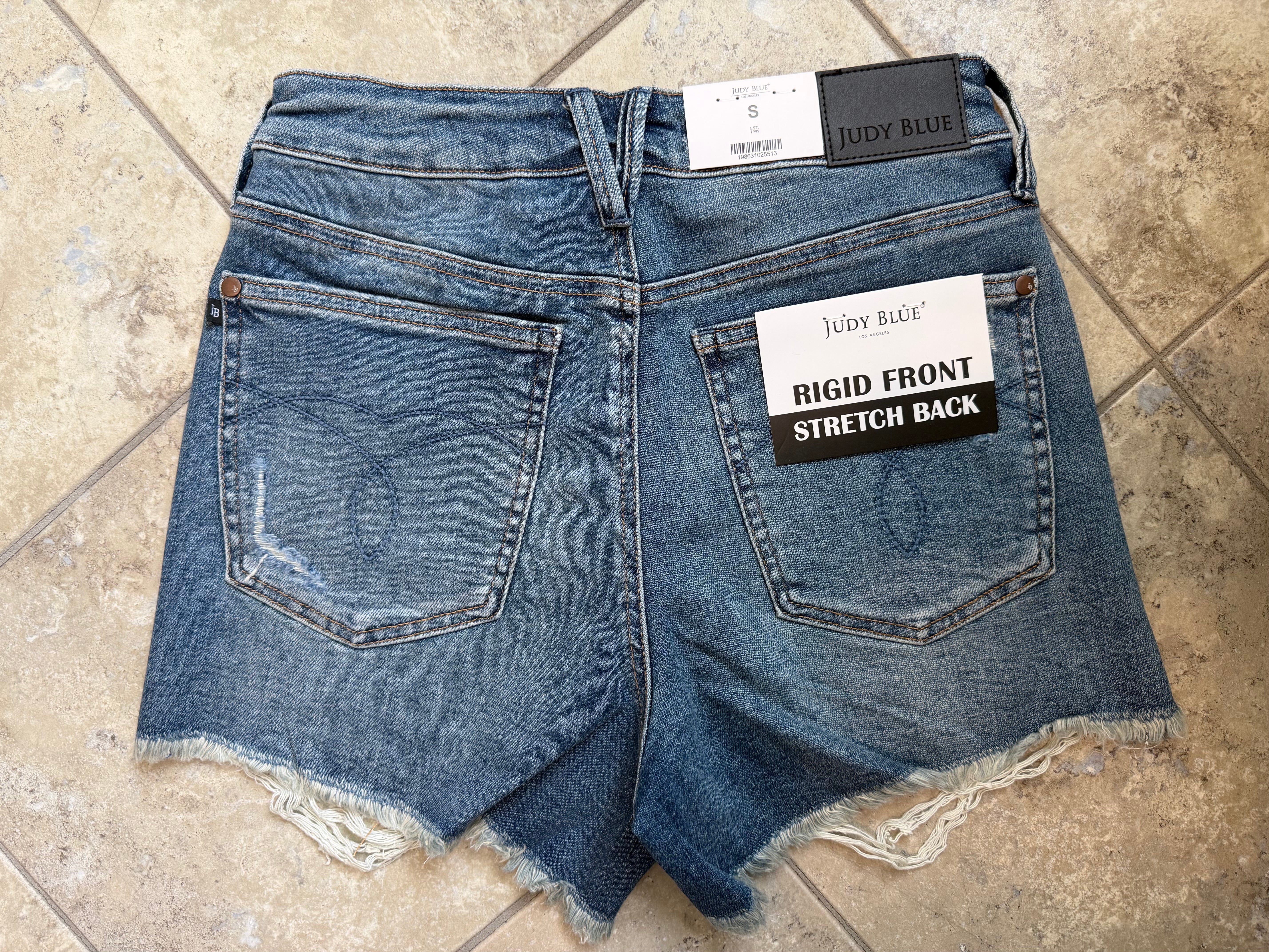 Crafted from Judy Blue’s signature Rigid Magic denim, these shorts feature a structured, vintage-inspired feel in the front with comfortable stretch in the back—giving you shape, support, and all-day wearability. The cut-off hem adds a casual, lived-in vibe that’s perfect for warm-weather styling.