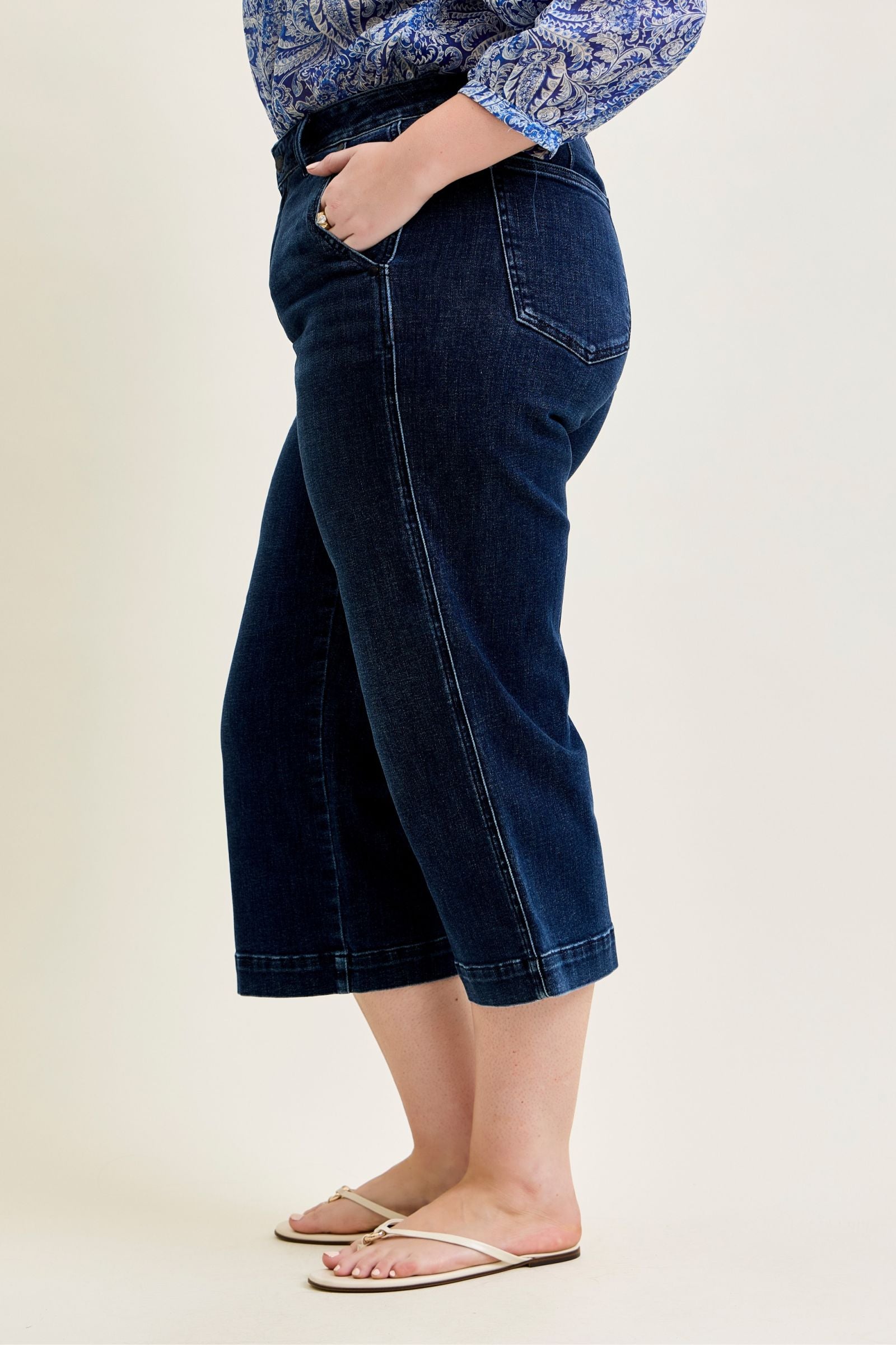 The ankle length pairs perfectly with everything from sandals to sneakers to booties, and the dark wash keeps them versatile for dressing up or down. Finished with darted back pockets for a more tailored, flattering fit and a wide hem for a structured look.