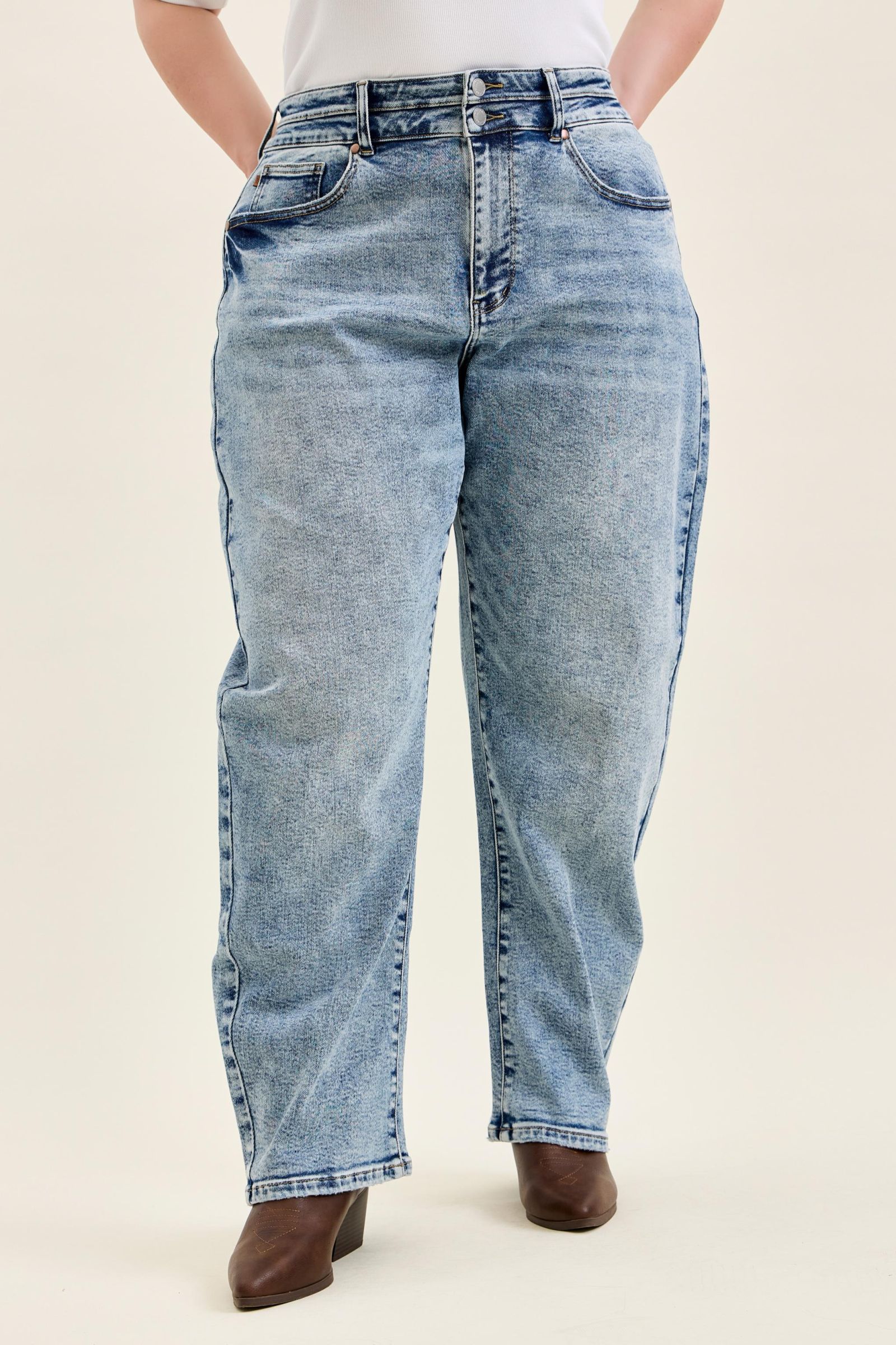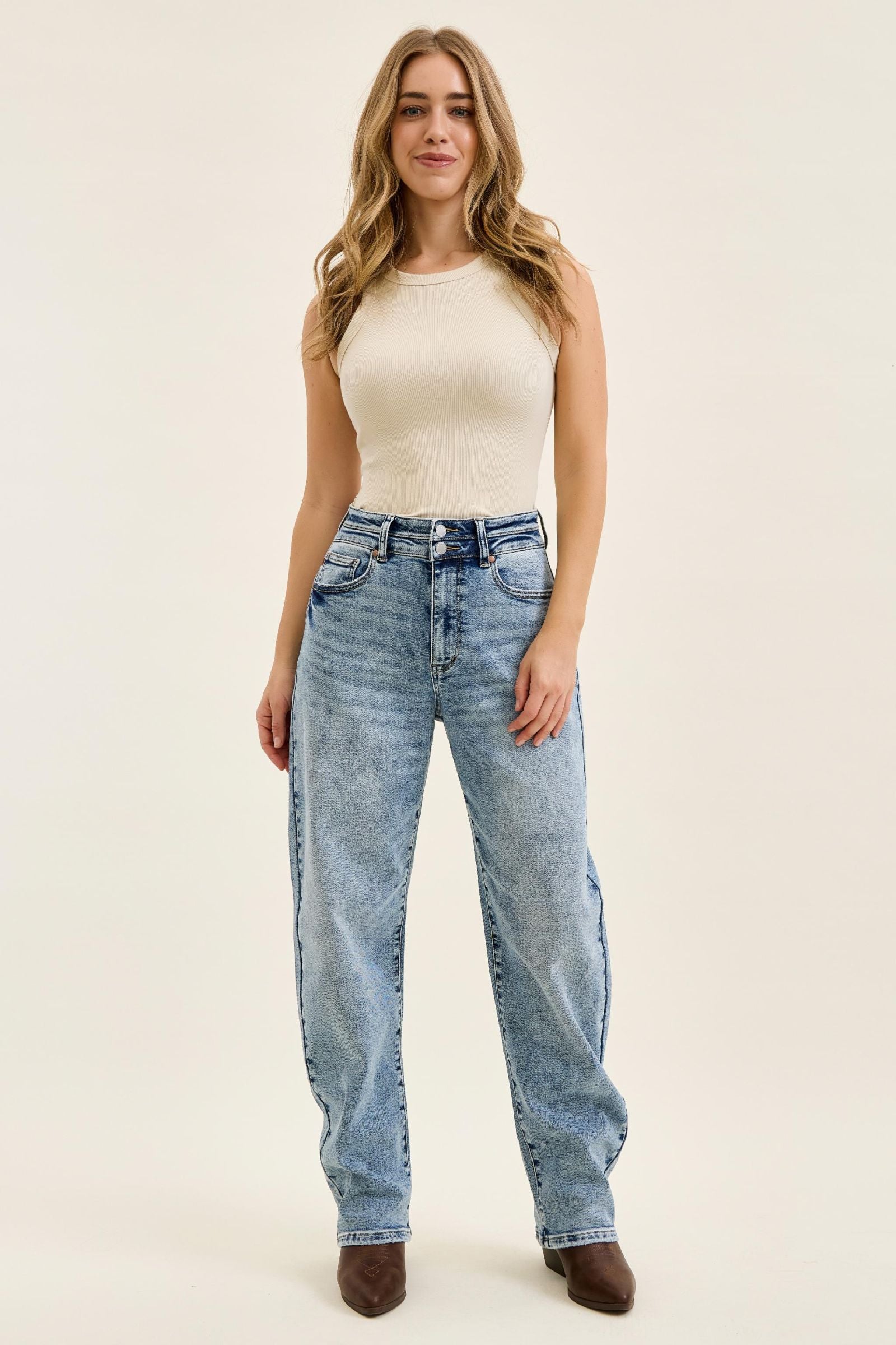 A true statement denim—these Marlow Arc jeans bring a bold, fashion-forward look with a flattering fit you’ll love. The high waist features a unique double button waistband that adds structure and a little extra edge, while the vintage acid wash gives them that perfectly worn-in, throwback vibe.