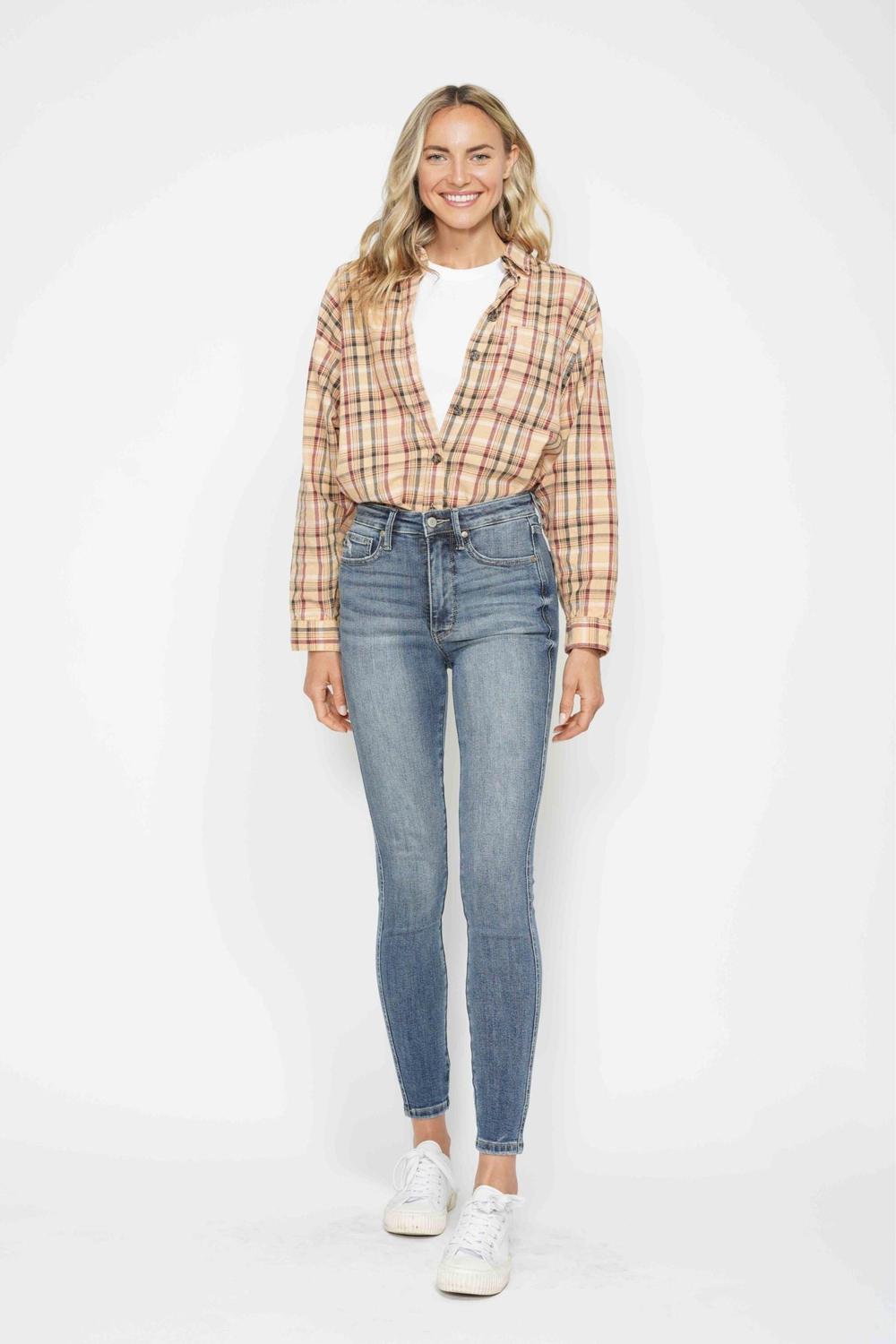 Sleek, sculpting, and ultra-flattering — the Judy Blue High Waist Tummy Control Contrast Wash Skinny Jeans are a wardrobe essential with a modern twist. Designed with Judy Blue’s signature tummy control technology, these jeans smooth and support your midsection while maintaining all-day comfort. The contrast wash detail adds subtle contouring and visual dimension, enhancing your shape in all the right ways.
