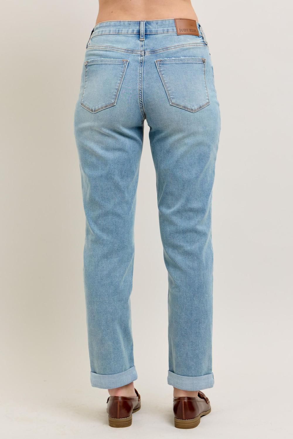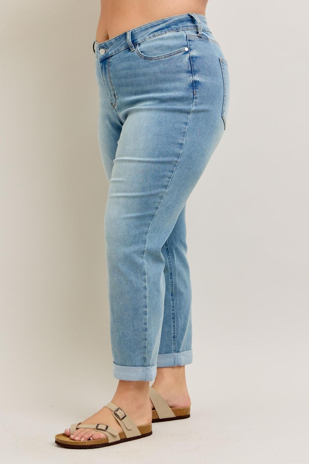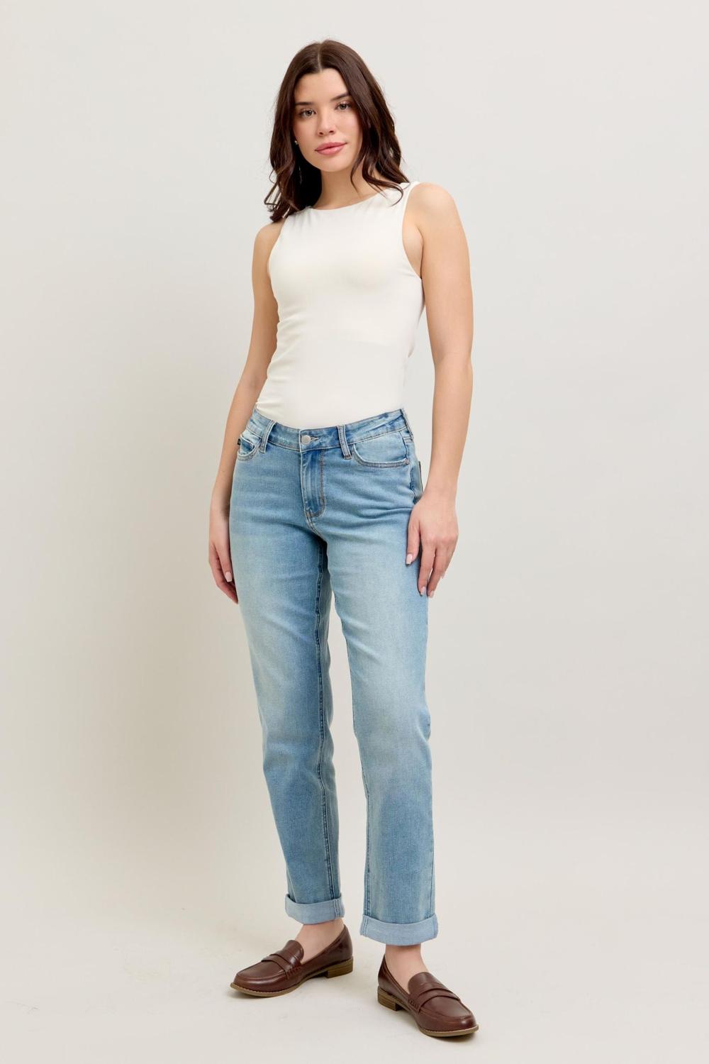 Stay cool and comfortable with Judy Blue’s V front cuff boyfriend jeans. Featuring a mid rise and relaxed boyfriend fit, these jeans are designed with Sorbtek® recycled fibers that wick away moisture and keep you feeling fresh all day. The V-shaped front waistband and cuffed hem give them a modern twist on a classic relaxed fit.